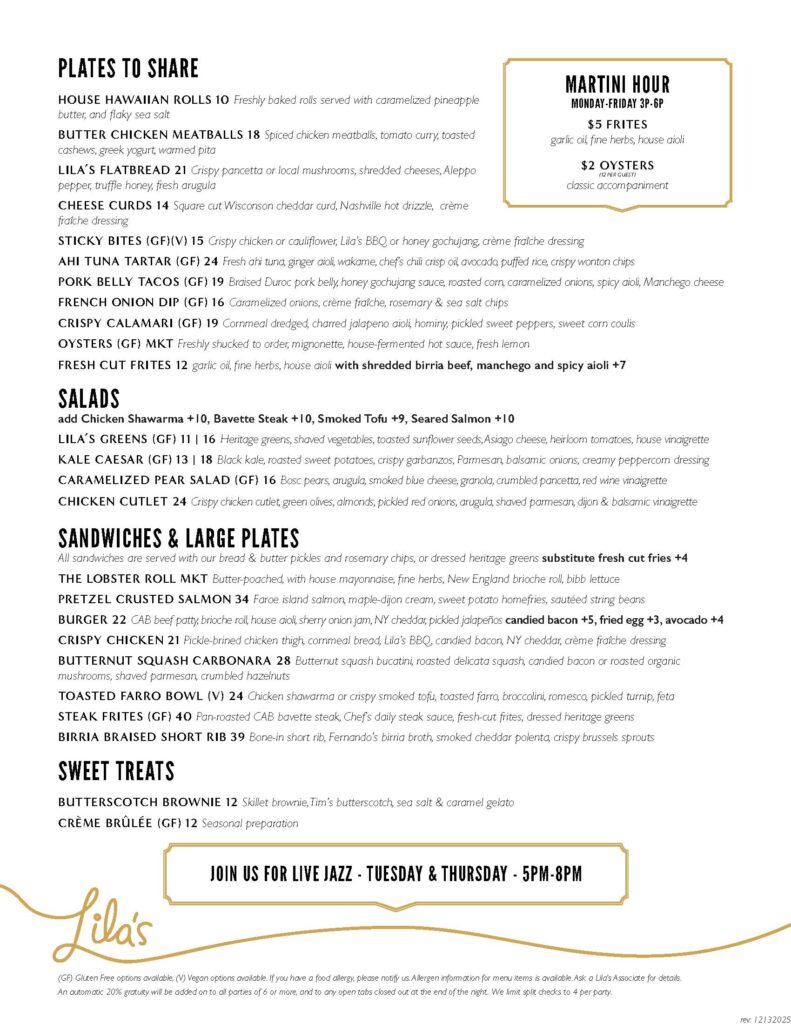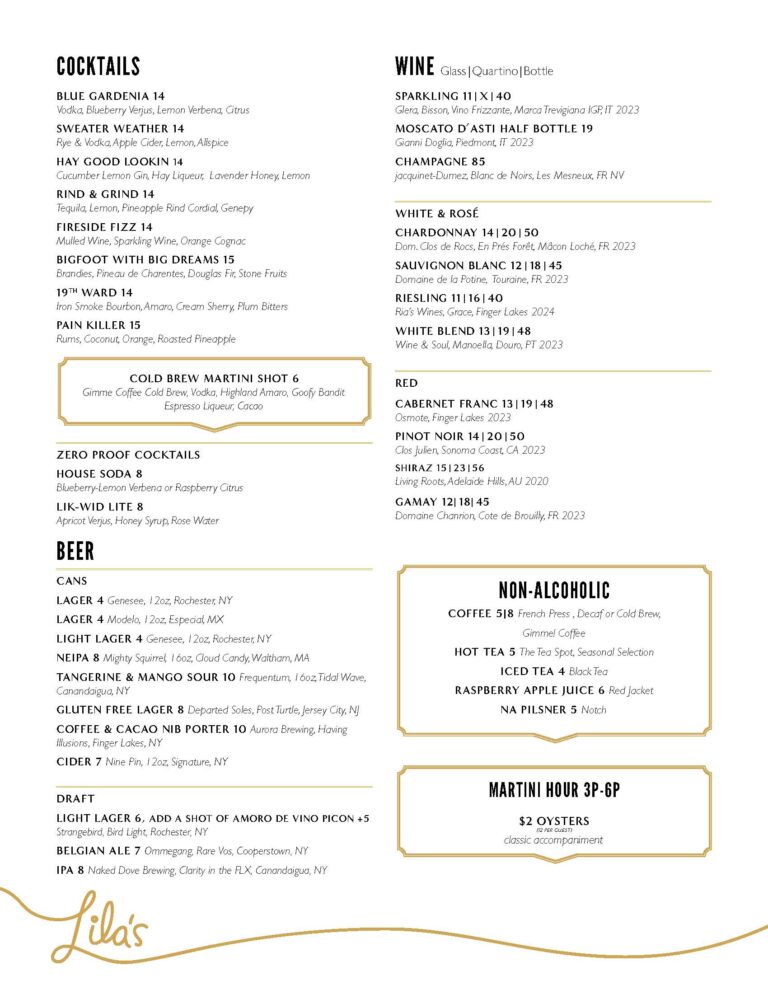 Lila’s accomplished cocktail and beverage stewards serve seasonal cocktails, playful small plates, and timeless appeal.