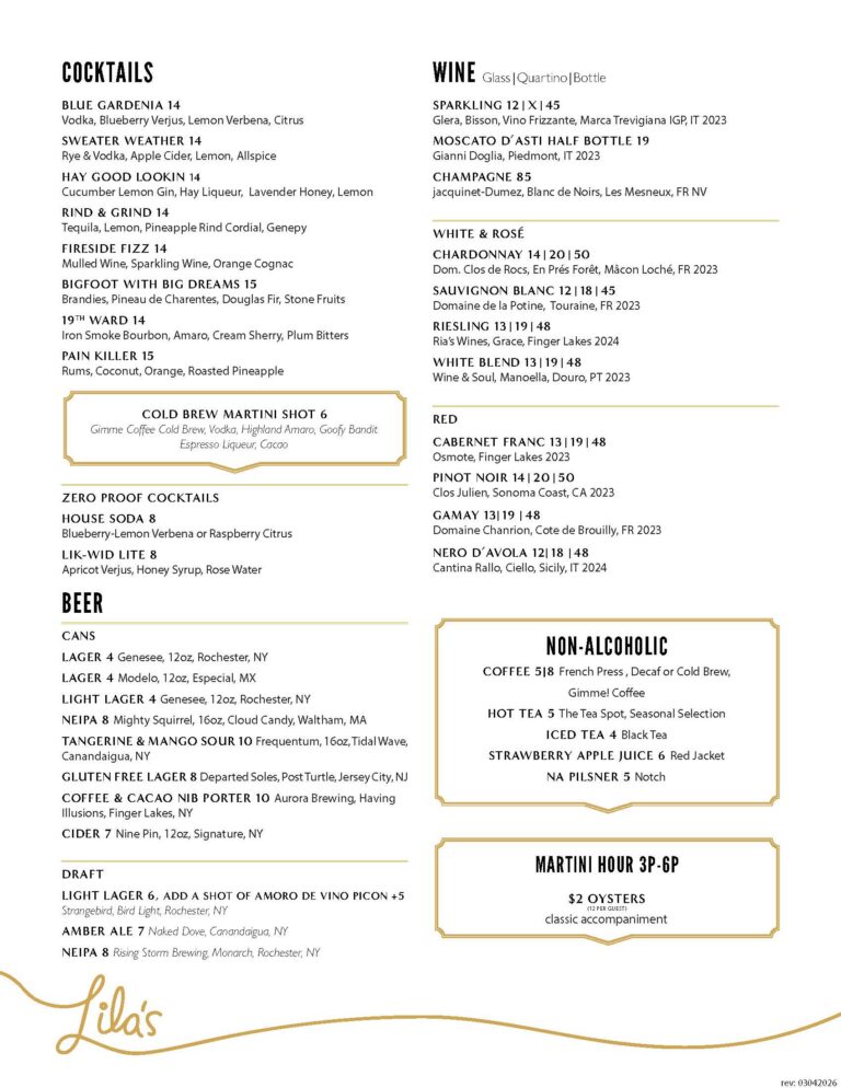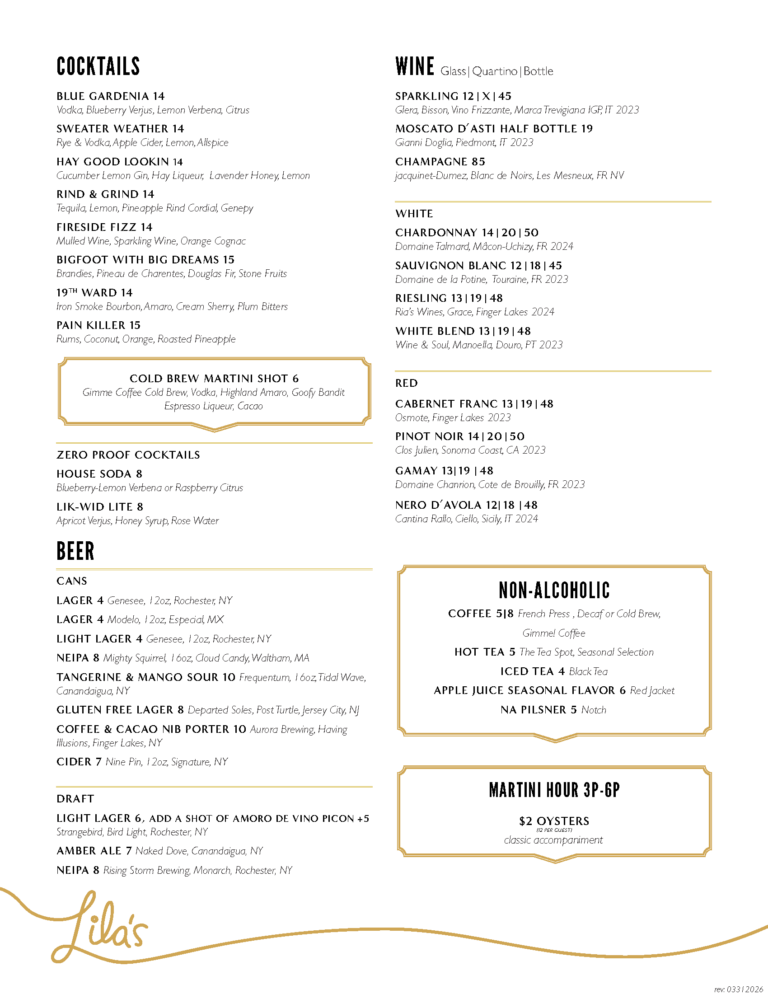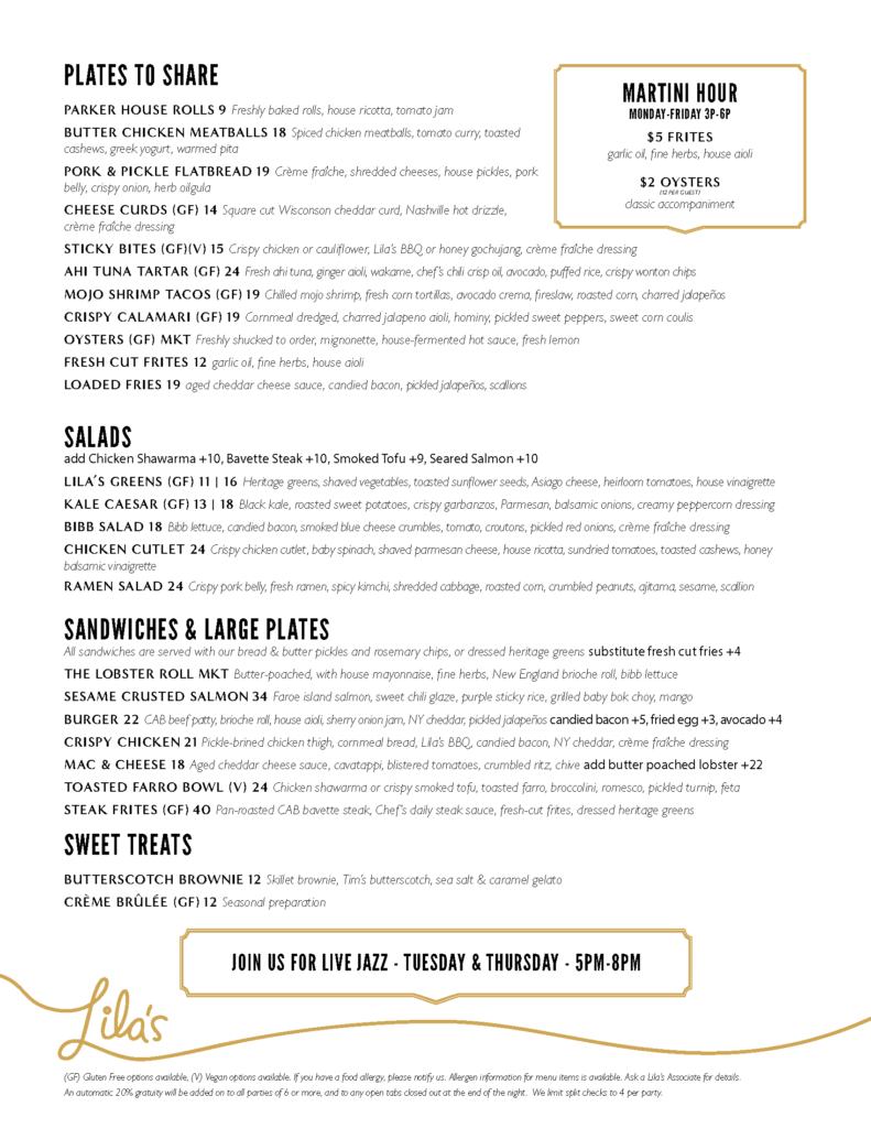 Lila’s accomplished cocktail and beverage stewards serve seasonal cocktails, playful large and small plates, and timeless appeal.