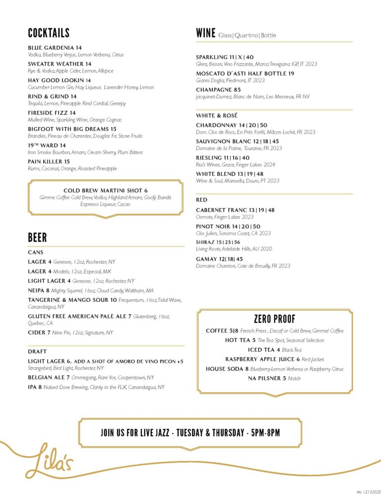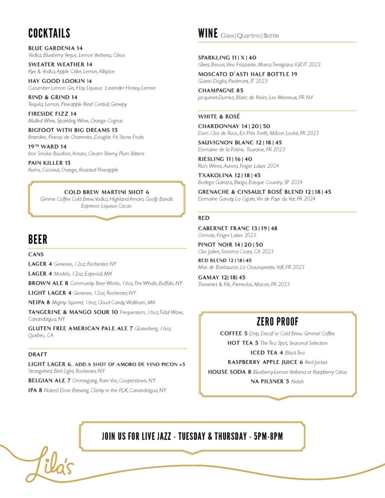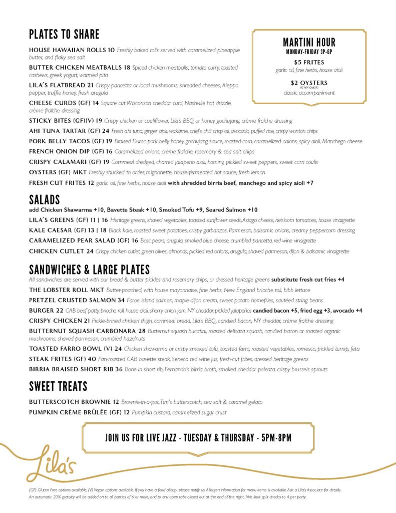 Lila’s accomplished cocktail and beverage stewards serve seasonal cocktails, playful small plates, and timeless appeal.